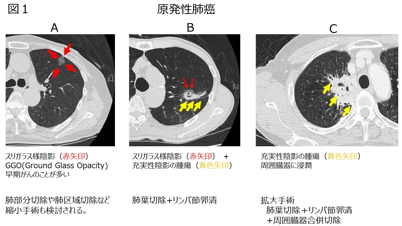 がん細胞の密度が多くなると固い充実性腫瘍となります。通常は肺葉切除とリンパ節郭清を行います。