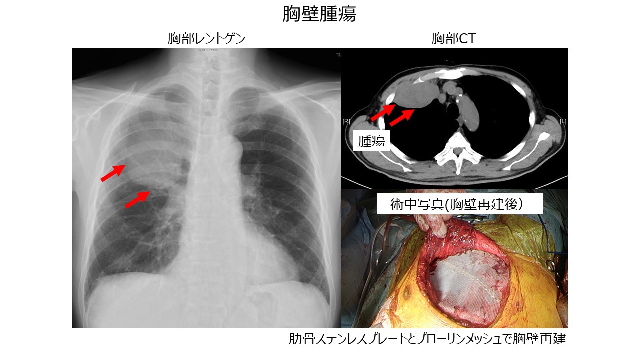 肋骨や胸骨から生じる骨腫瘍や、筋肉(肋間筋・横隔膜など)や脂肪などから生じる軟部腫瘍、他臓器からの癌が胸壁に転移(転移性胸壁腫瘍)などがあります。胸壁腫瘍の場合、腫瘍の大きさよりも一回り大きく切除するため、その場所・大きさによって補強(チタン製プレートや網戸の網のようなメッシュ)、再建(形成外科医協力のもと筋肉付き皮膚(筋皮弁)など使用)することがあります。