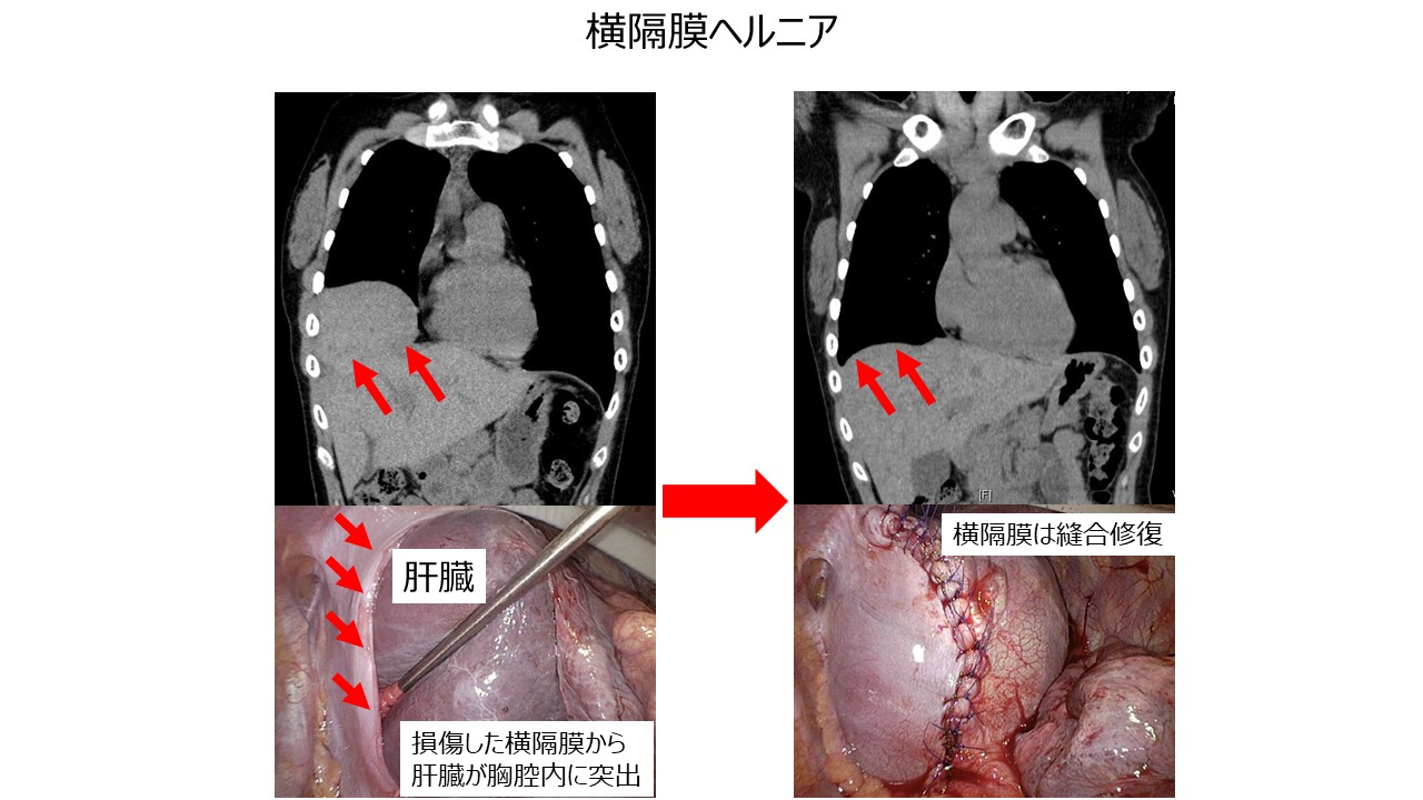 横隔膜が先天的または後天的(外傷や手術など)で穴が開き、肝臓や腸管などの腹腔内臓器が胸腔へ入りこんでくる状態(ヘルニア)です。横隔膜は薄い筋肉ですのでしっかりとした縫合修復をしたり場合によっては人工物であるGORE-TEXシートで補強を行います。